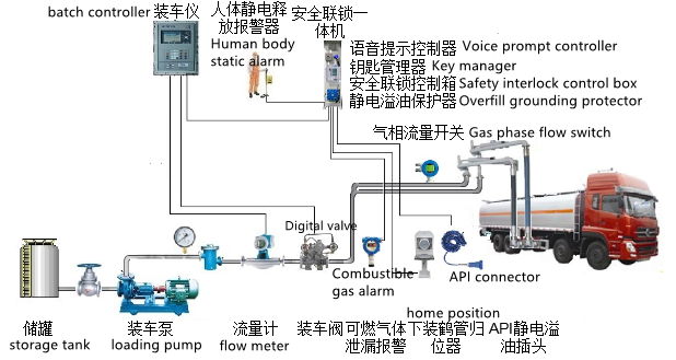 7. The operator installs the liquid-phase loading arm. (Five interlock, loading arm return interlock. If the loading arm joint and the tanker joint are not in place, then the valves of both parties cannot be opened and the oil filling operation cannot be carried out. The oil filling is completed, and conversely, if either side of the valve If it is not closed, the loading arm cannot be removed from the truck, thus effectively avoiding the phenomenon of oil running and oil leakage.)